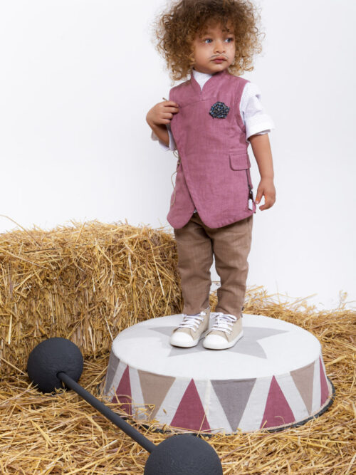 Έρως-Υπόλευκο λινό trench coat γιλέκο με militaire δερμάτινες λεπτομέρειες, λευκό cotton πουκάμισο με παπιγιόν και κλασικό χαμηλοκάβαλο παντελόνι με πιέτες. Ζώνη από κορδόνι με λεπτομέρεια ψαράκι.